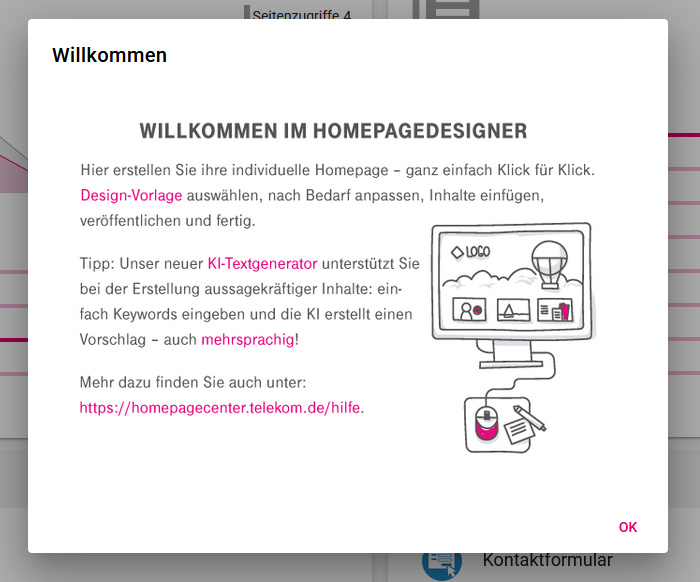 Per Update wurde der Homepage Designer um ein wertvolles Feature erweitert. Nutzen Sie jetzt KI, um neue Texte für Ihre Homepage zu generieren. Wie der KI-Generator genutzt werden kann, beschreiben wir im Artikel Der KI-Textgenerator.