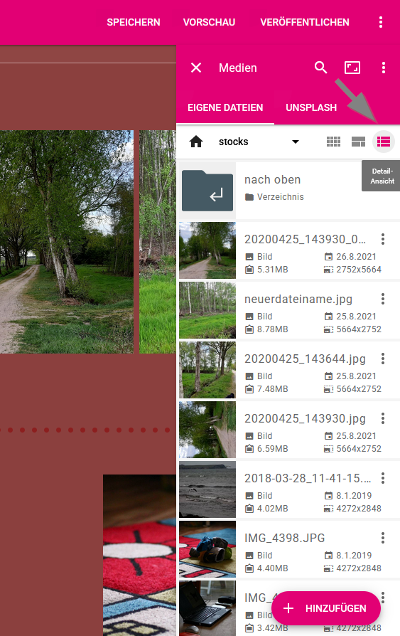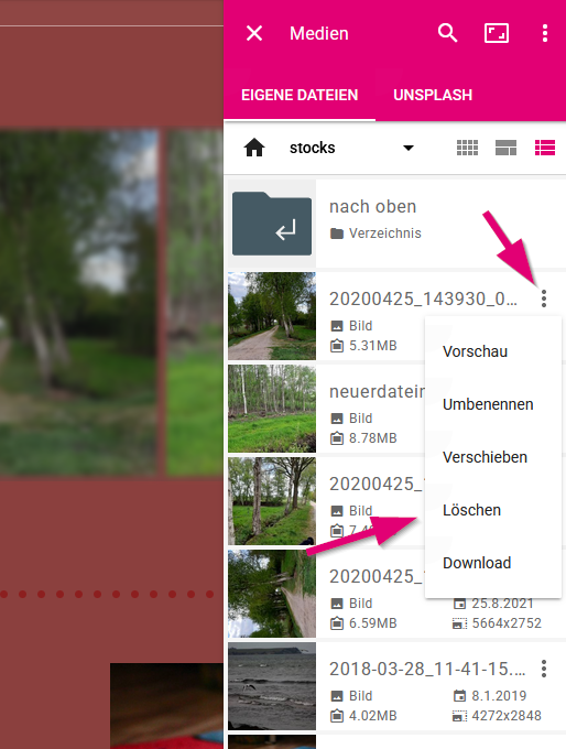 - Jetzt wurden die Bilder in diesem Beispiel aber noch nicht endgültig gelöscht, sondern nur von der Seite entfernt. Um die Dateien endgültig Löschen zu können, bitte über den Button "Webseite bearbeiten / Medien" in die "Eigenen Dateien" wechseln und die Detailansicht aufrufen.
